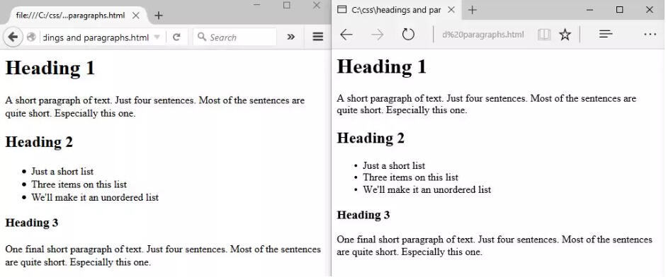 <p>One final short paragraph of text. Just four sentences. Most of the sentences are quite short. Especially this one.</p>If we render that code in two different browsers we will see subtle differences. Here’s how Mozilla Firebox and Microsoft Edge render that code.